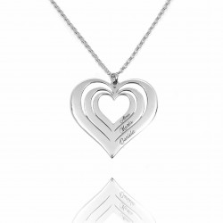 Colgante Corazón con tres nombres en plata de ley 925 Personalizados, cadena rolo y cierre de reasa plata de ley 925. Medida de los colgantes: 32 mm.